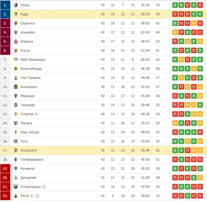 Уеска та Кадіс вийшли у Прімеру. Сарагоса, Альмерія та Жирона гратимуть плей-офф. Доля останньої путівки в плей-офф вирішиться після матчу Фуенлабради.