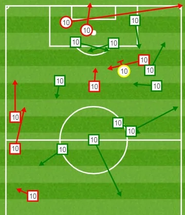 Карта передач (квадрати) і ударів (кола) Романа Зозулі