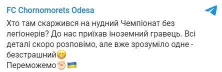 До нас приїхав іноземний гравець. Всі деталі скоро розповімо, але вже зрозуміло одне – він безстрашний", – повідомила прес-служба "моряків" на своїй сторінці у соціальній мережі Telegram.
