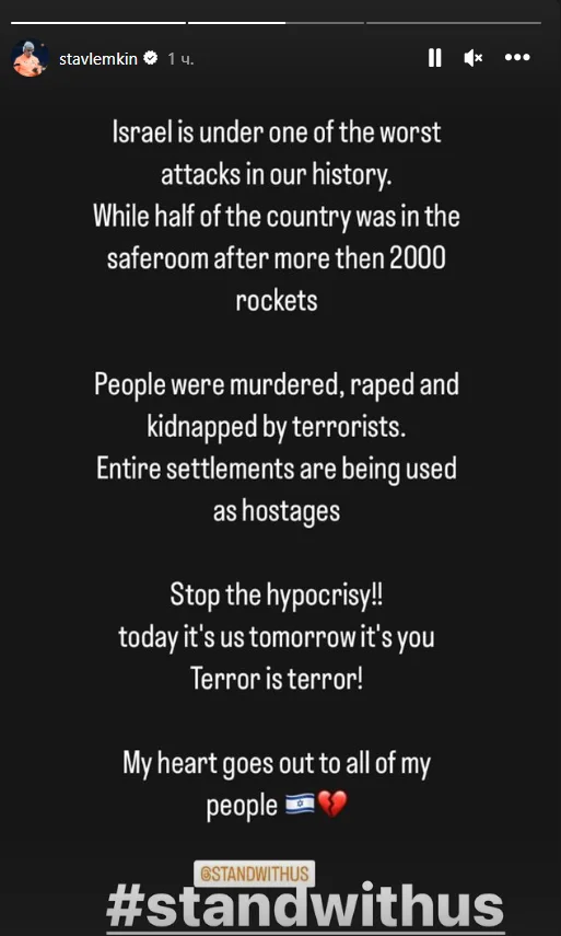 Люди вбиті, згвалтовані та викрадені терористами. Цілі поселення перебувають у заручниках. Зупиніть лицемірство! Сьогодні ми, а завтра – ви! Терор – це терор! Моє серце з усім моїм народом. Підтримайте нас", – написав Лемкін на своїй сторінці у соціальній мережі Instagram.