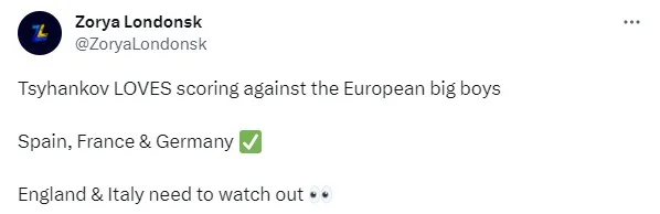 Проте вчасно на авансцену вийшов наш найкращий легіонер сезону 2022/23 Віктор Циганков. Zorya Londonsk (Андрій Тодос) зауважив цікаве: "Циганков любить забивати європейським "великим хлопцям". Іспанія, Франція, Німеччина. Англії та Італії – приготуватися!"