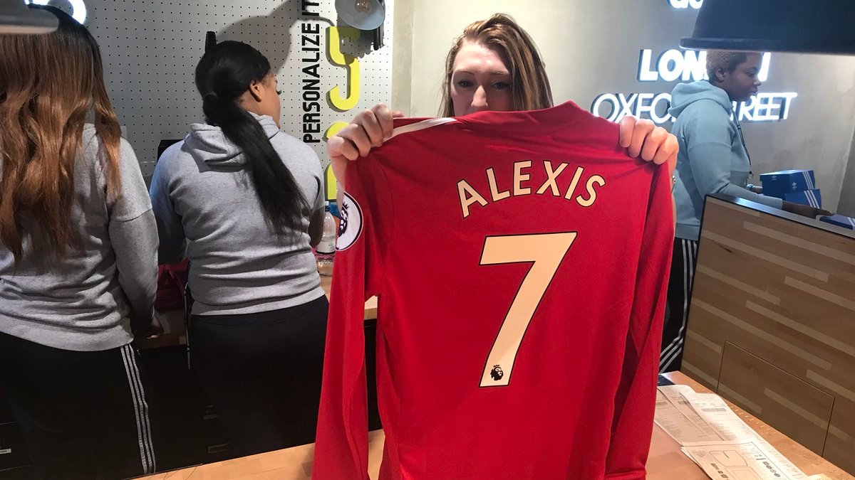 Британская сеть магазинов спортивной одежды и экипировки Адидас начала продажи футболок Манчестер Юнайтед с именем Алексис и 7 номером на спине. Один из болельщиков поблагодарил в своем Твиттере AdidasUK за возможность приобрести товар.
