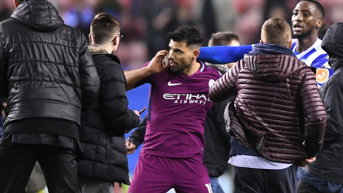 После окончания поединка фанаты Уигана прорвались на поле. Игроки команд еще не успели покинуть газон. Болельщик гостей подбежал к Агуэро и начал что-то выкрикивать ему на ухо. Аргентинец разозлился и попытался ударить болельщика. Ситуацию разрядил защитник Уигана Шайенн Данкли.