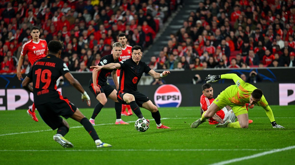Иньиго Мартинесу прошлись по ноге. Это не красная, а желтая для испанца, который возмутился этим фактом и в отчаянии выбросил щиток. Бальде в феноменальном дриблинге прошел 5 флажков (пардон, игроков Бенфики) от своей штрафной до центра поля. Если бы Антониу Силва не сфолил на желтую, так бы по автостраде выскочил аж до Трубина! Какой же очередной провал правого фланга обороны Бенфики. Рафинья настолько легко прошел, что потом просто бездарно покатил на защитника, хотя и Левандовски, и Ямал были вполне себе свободны.