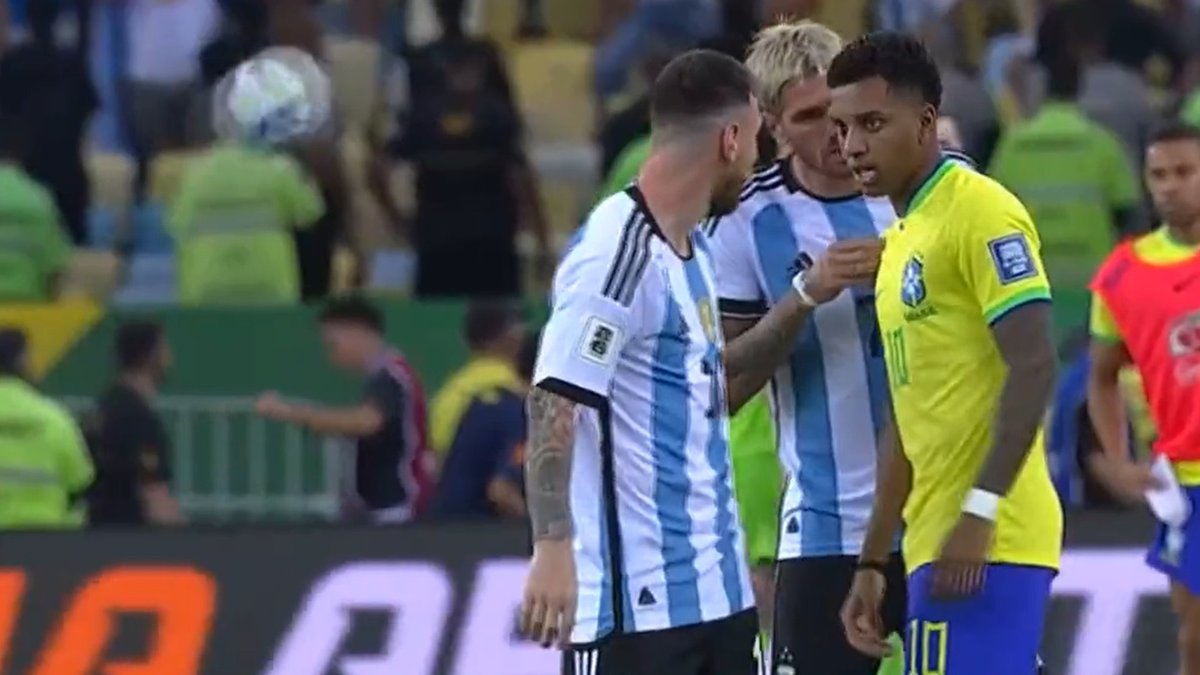 Когда сборная Аргентины вернулась на поле, Родриго де Пауль в эмоциональной манере что-то обсуждал со звездой Реала Родриго. К ним присоединился Месси, который во время спора схватил бразильца за шею сзади.
