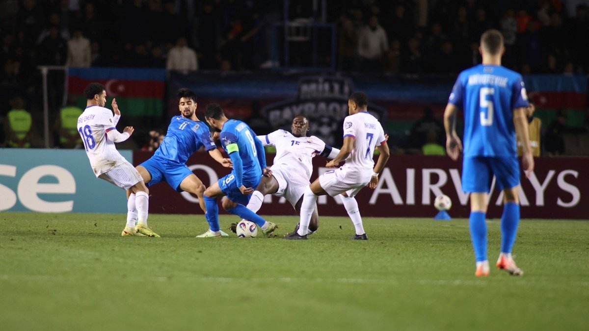 Азербайджан удивил соперника уже на 3-й минуте: Дашдамиров отпасовал на Дадашова, и тот быстро пробил в центр ворот, переиграв Шевалье – 1:0! Французы ответили уже на 17-й минуте: Жан-Филипп Матета забил головой. Далее Кристофер Нкунку вывел команду Дешама вперед, однако гол был отменен из-за нарушения правил.