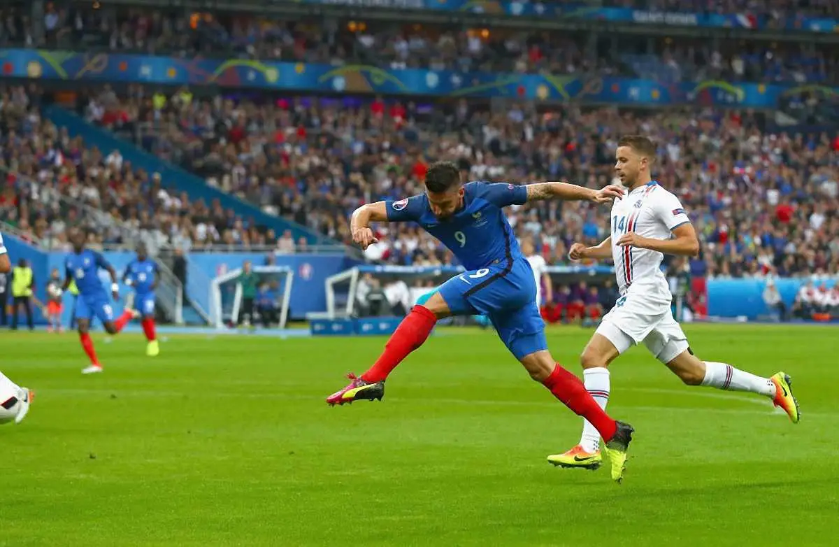 Франция активно начала поединок с первых секунд, а Жиру реализовал свою возможность на 12 минуте. Исландия ничего не смогла противопоставить хозяевам чемпионата, и до перерыва проигрывала с разгромным счетом 4:0. После перерыва исландцы смогли отквитать один мяч, а сразу после этого Жиру оформил дубль. В конце матча исландцы еще раз забили, поставив точку в матче.
