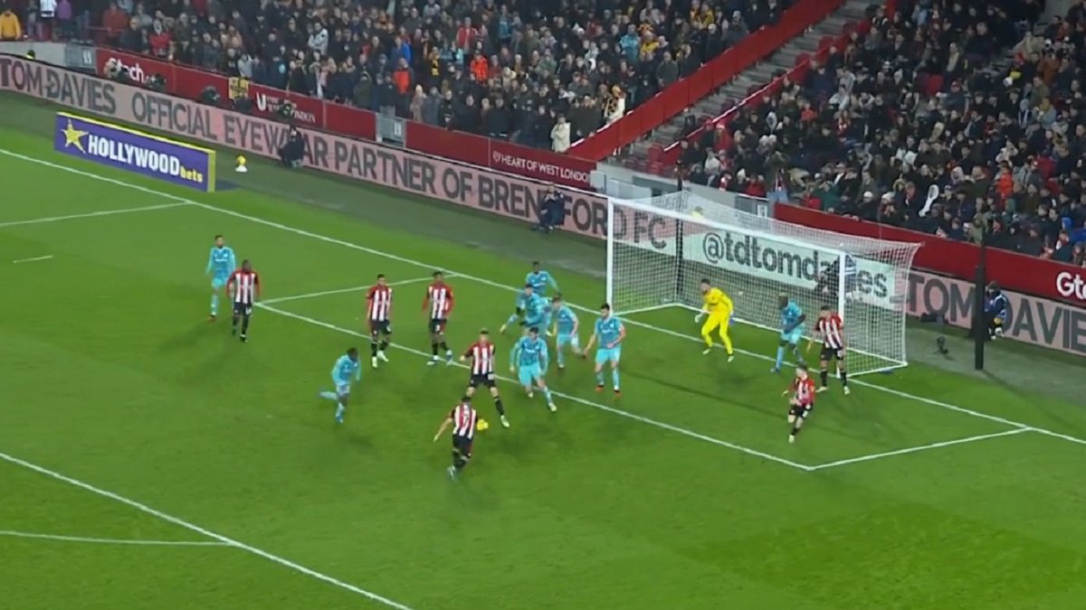 Получив численное преимущество, Брентфорд тотально забрал мяч, но моментов было мало. Можно вспомнить разве что неточный удар Йенсена с линии штрафной. Лишь в конце тайма хозяева провели несколько атак и забили. Гол получился сумбурным – Мопе подобрал мяч в суматохе в штрафной и поразил верхний угол ворот. 1:0 – итог первого тайма.