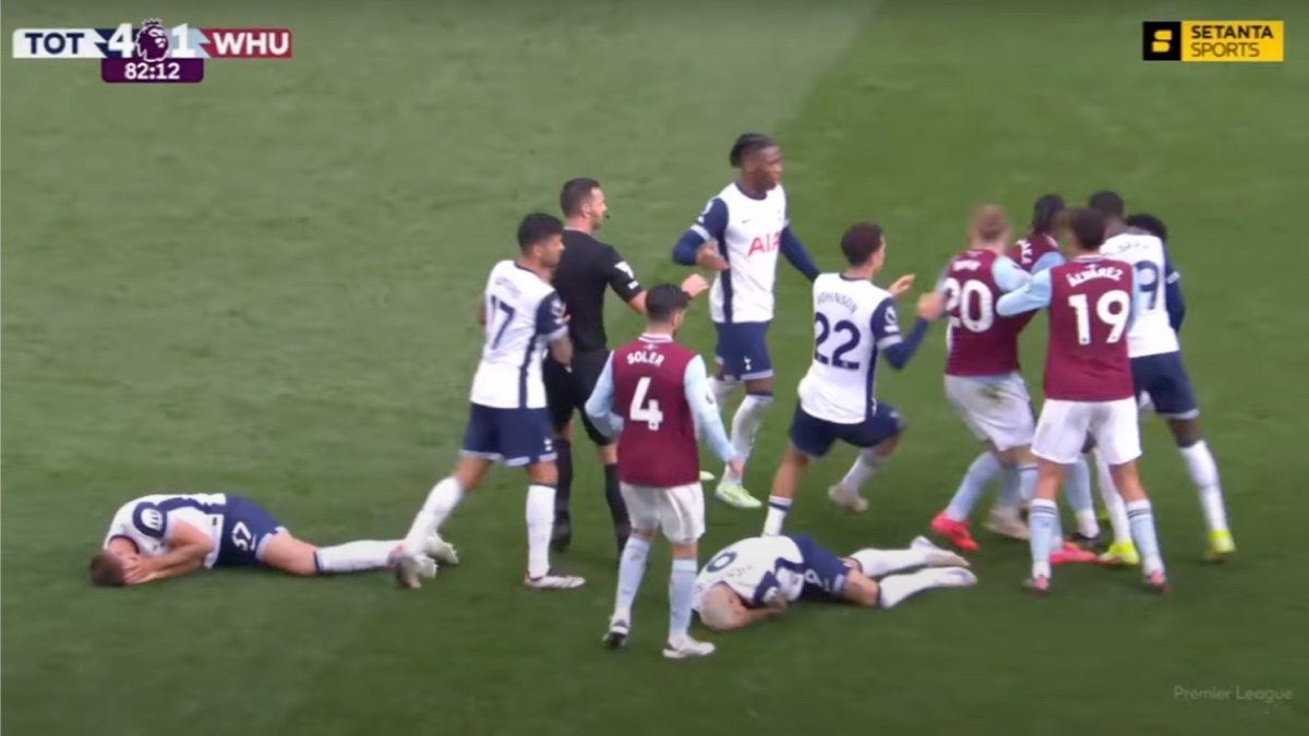 В конце матча произошло самое интересное: в борьбе за мяч с Мики ван де Веном Кудус слишком активно пытался забрать мяч, в результате чего защитник Тоттенхэма упал на газон. Кудус несколько раз ударил лежащего соперника, а затем, отпрыгнув, случайно ударил головой Ришарлисона в лицо и успел ударить Биссума. Как следствие, игрок Вест Хэма получил прямую красную карточку.