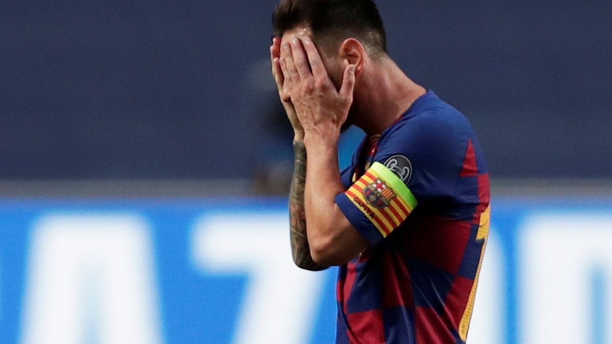 На фотографии изображен форвард каталонцев Лионель Месси и голкипер команды Марк-Андре тер Штеген. Напомним, на перерыв команды ушли при счете 4:1 в пользу мюнхенского клуба.