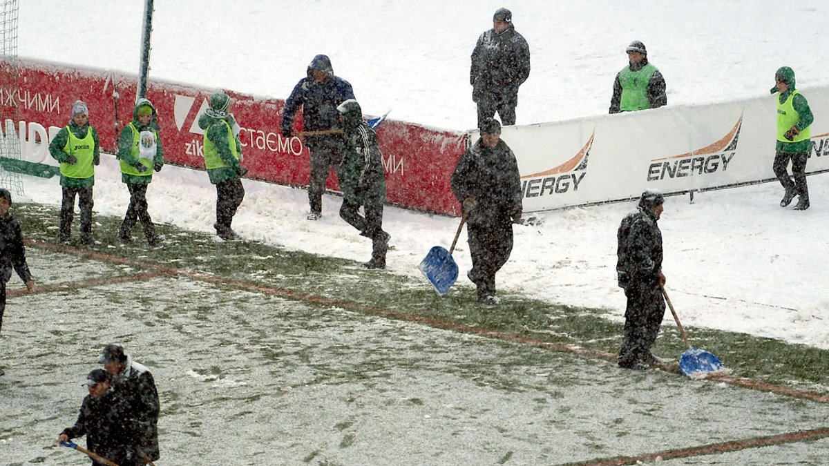 "45 мин. Похвально, что арбитр попытался сделать все, чтобы матч таки состоялся, несмотря на погодные условия и несмотря на то, что состояние газона было на грани того, чтобы игру не проводить. К сожалению, во время первого тайма матча, погодные условия только ухудшались − продолжал идти снег, который постоянно застилал линии разметки поля (что является существенным аспектом для игры).