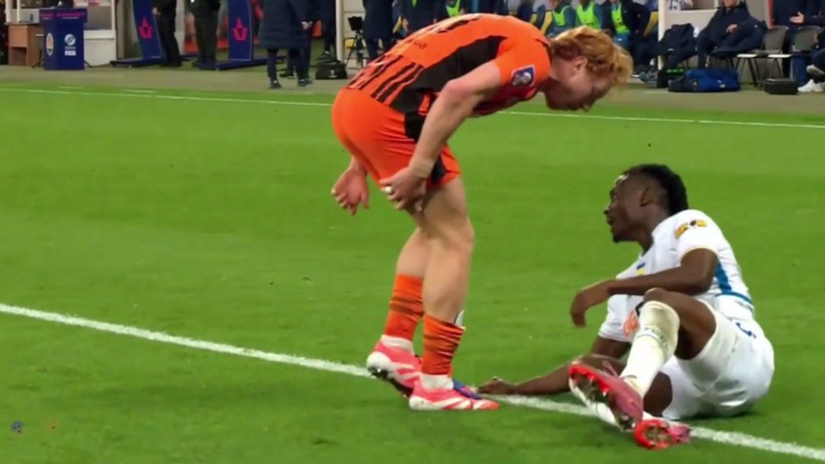 После того как Огундана оказался на газоне, Ефим Конопля подбежал к нему и начал провоцировать. Нигериец легонько оттолкнул украинца, но защитник "горняков" свалился на газон и начал держаться за горло.