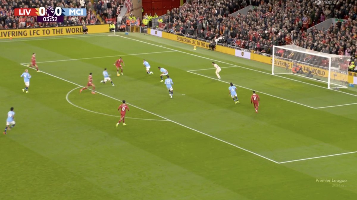 Диас постоянно заводится на контратаках. Колумбиец катит на Трента, который врывается на 11-метровую отметку, но оставляет Гакпо. Снаряд выше летит! По касаниям в чужой штрафной (11:0) просто феноменальное доминирование Ливерпуля над гостями. В какой-то момент все же команда Гвардиолы перехватила инициативу, но из владения в более 70% только довольно опасные подходы к штрафной, без ударов. Нуньеш получил желтую за грубый удар по ногам Трента, который только вернулся после травмы.