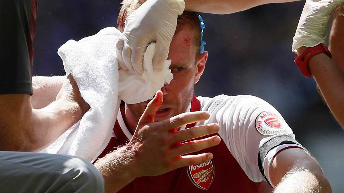 На 28-й минуте встречи Мертезакер получил удар локтем от Гари Кэхилла во время борьбы в верховой дуэли. После этого немецкий защитник получил ужасное рассечение, кровь пришлось останавливать врачам. Однако Пер все же не смог продолжать игру и был заменен на 33-й минуте. Первый тайм завершился вничью 0:0.