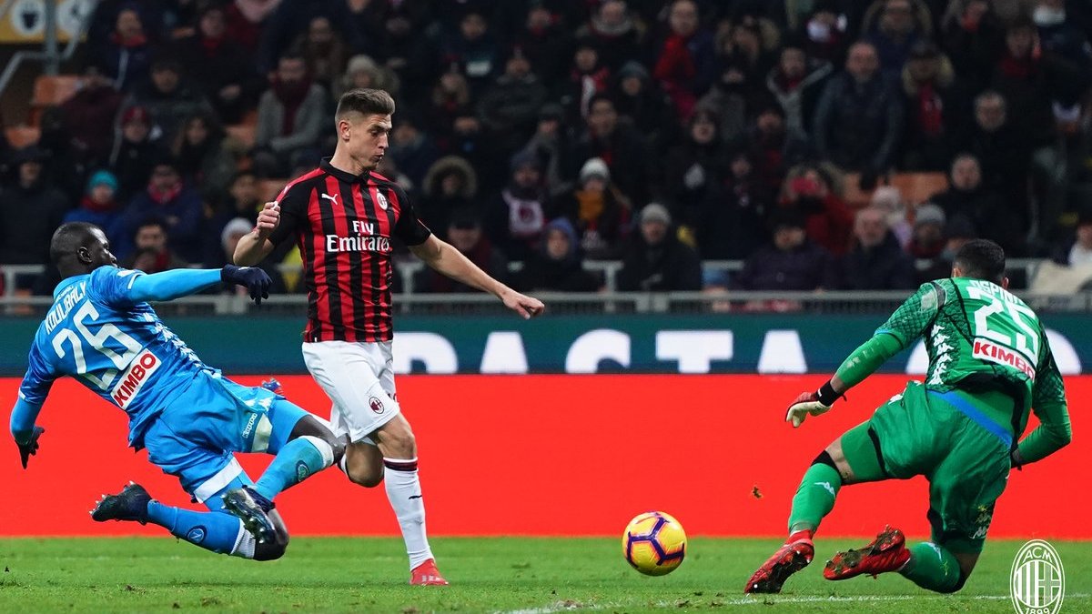 Первый тайм прошёл очень ровно. Дебютный момент во встрече на 6-й минуте создали неаполитанцы: Кальехон замкнул подачу на правый край штрафной мощным ударом в ближний угол – Доннарумма парировал. Миланцы ответили на 9-й несложным для Оспины выстрелом Сусо с дистанции, но уже через минуту упустили супермомент после стеночки Чалханоглу с Пакетой. Турок разрезал оборону пасом на Кутроне в штрафную, а Патрик выскочил на ударную позицию и пробил в девятку – мяч коснулся сетки с внешней стороны.