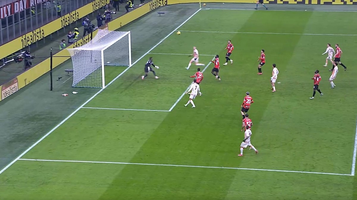 Тео подает угловой, Уокер отклеивается от Анхелиньо и классно пробивает под перекладину. Свилар вытаскивает, замены какой-то обратный эффект приносят на старте второй половины. А вот и он. Довбик отобрал на правом фланге ближе к угловому флажку. Атаку развернули слева, где Анхелиньо уже привычно прекрасно подал (рикошет от соперника только добавил остроты) на дальнюю, где Довбик без всякого офсайда расстрелял Меньяна. Это 7 гол Артема (еще 2 ассиста) за 11 матчей Ромы.
