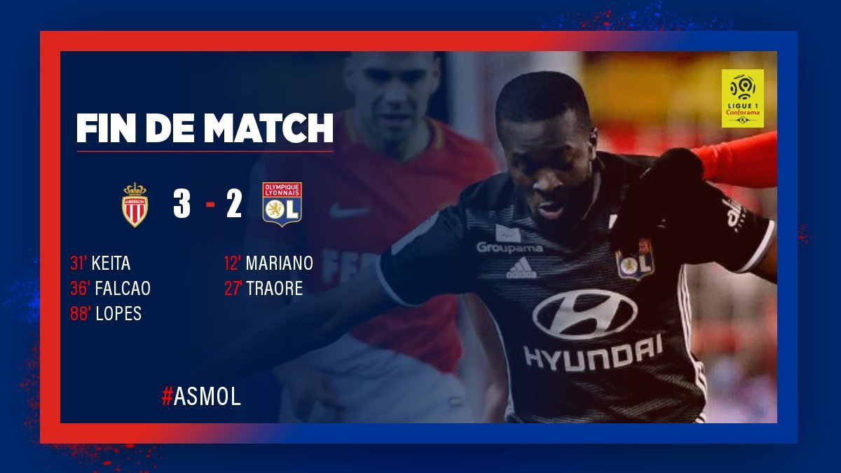 Монако в родных стенах уступал Лиону 0:2 уже на 27-й минуте. Впрочем, "монегаски" дважды забили еще до перерыва, но потеряли Кейту после удаления. Уже вдесятером хозяева забили третий гол и сохранили победный счет 3:2 до финального свистка.