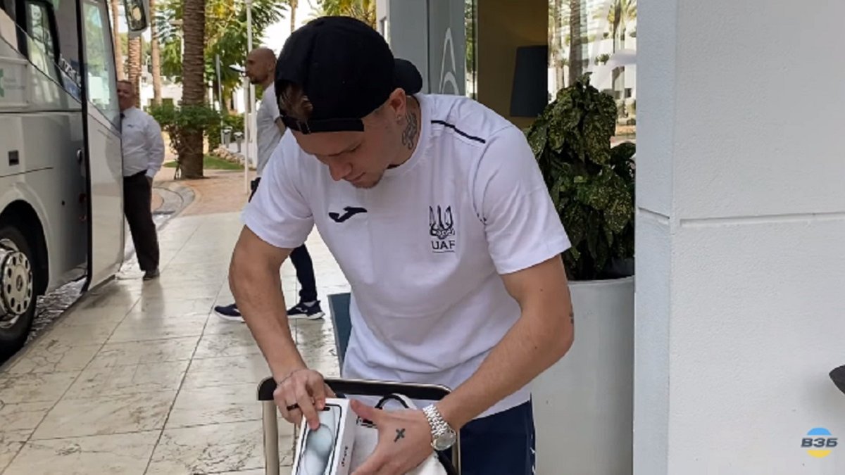 Перед отъездом украинской делегации из Испании в Боснию пресс-секретарь "сине-желтых" Александр Глывинский, который ежедневно выкладывает видео из лагеря команды, получил от Михаила Мудрика новенький iPhone 15.