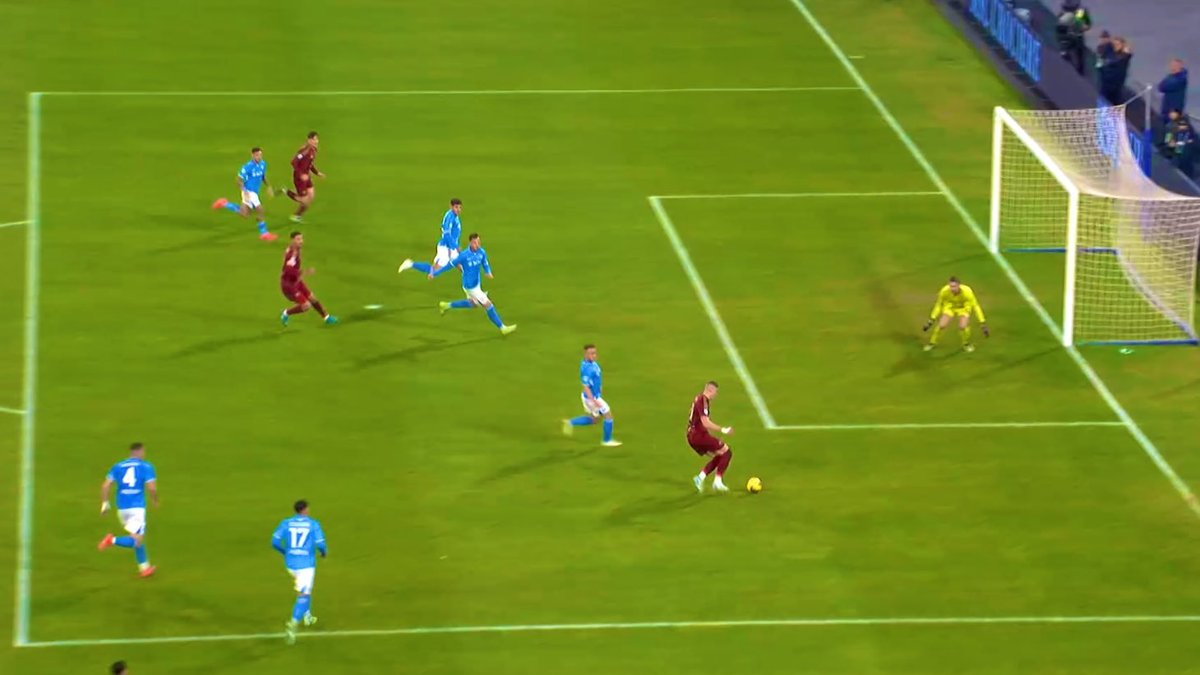 Конте делает по одной замене в каждом слоте, снимая Кварацхелию на 67-й и Лукаку через 12 минут. На поле сын Симеоне, Джованни, и Давид Нерес, известный по трансферу в Шахтер. Довбик сбрасывает, бьется с защитниками, но отлепиться или получить пас под удар уже практически нереально. Очень плотно защищает владения Мерета Наполи. К слову, его единственный сейв за матч – это выстрел чуть ли не с центра поля от Пизилли в первом тайме.