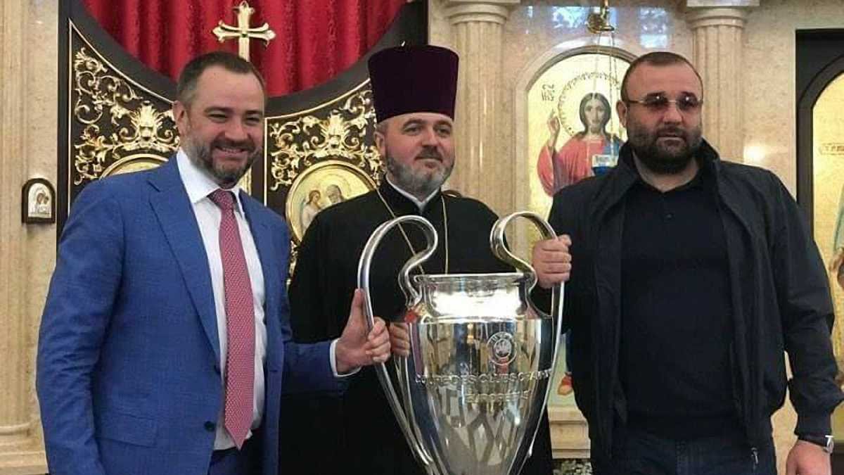 На трех фото настоятель церкви, Павелко, а также тесть его сына Александр Петровский позируют с кубком Лиги чемпионов, который сейчас путешествует по городам Украины перед финальным матчем в Киеве на НСК Олимпийский 26 мая.
