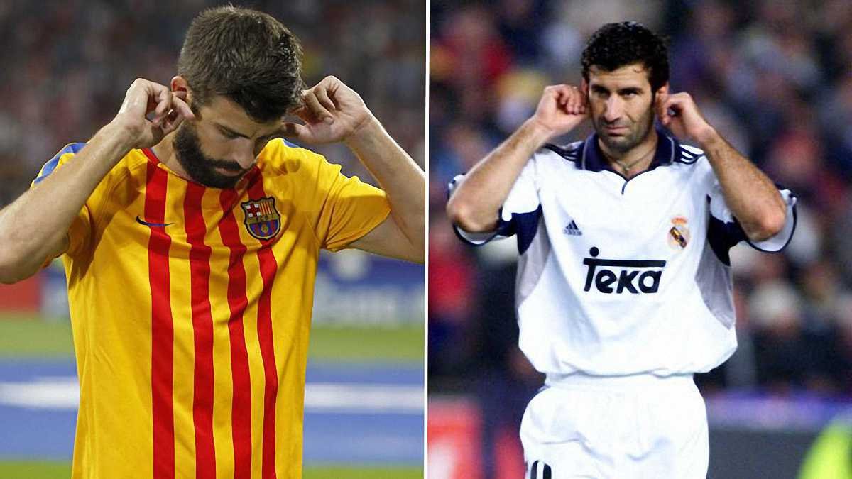 Знаменитый португалец, играя впервые на "Камп Ноу" после перехода из Барселоны в Реал, в ответ на свист фанатов демонстративно воткнул пальцы в уши. Такую же реакцию продемонстрировал и Пике в Мадриде.