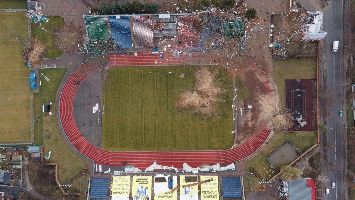 20:50. Люди помогают разбирать завалы на стадионе Десны.