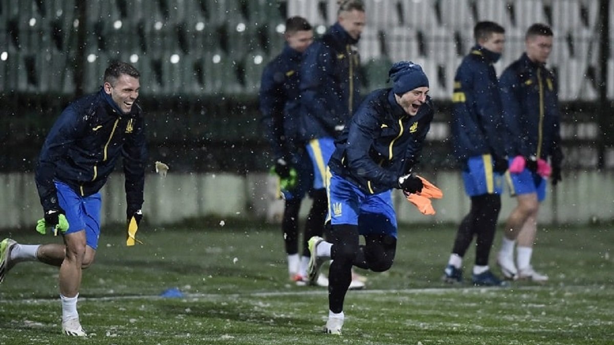 Во время тренировочной сессии выпал снег, что улучшило настроение игрокам сборной. Футболисты играли в крестики-нолики на газоне: команды соревновались между собой на скорость мышления, чтобы сложить победную диагональ из тренировочных манежек.
