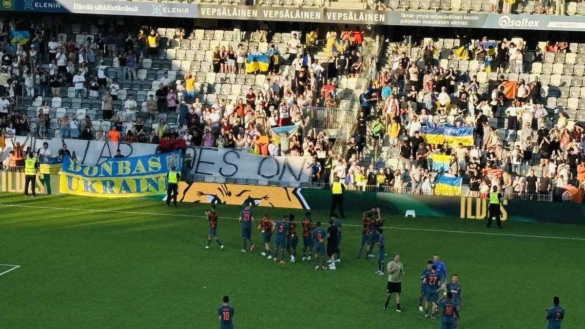 Поки команди розминалися, на трибунах зʼявилися синьо-жовті стяги з написами "Херсон", "Крим", "Нова Каховка" та банер "The war goes on". Нагадування, що війна триває, стюарди не знімали, а навпаки – допомагали закріпити.