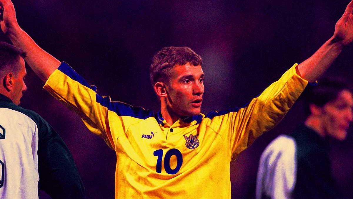 5. Андрей Шевченко преследует Робера Пиреса в ничейной битве между Украиной и Францией. Отбор на Евро-2000.
