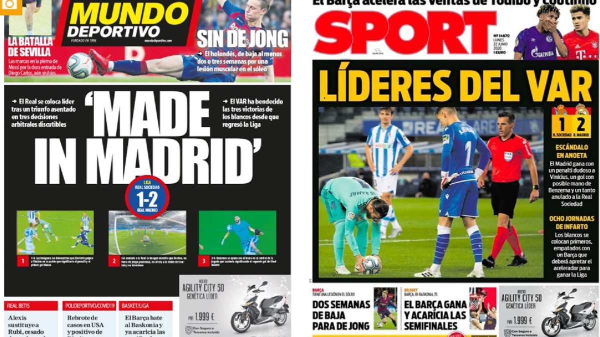 Diario SPORT розповідає про "лідерів VAR". Друга за популярністю спортивна газета Каталонії, крім трьох найбільш обговорюваних моментів, обурюється діями Каземіро, який ліктем перевірив на міцність щелепу суперника. Той епізод, можливо, заслуговував інтервенції відеоасистента з прямою червоною, тоді як Естрада Фернандес обмежився жовтою карткою.