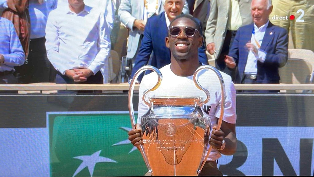 В субботу, 31 мая, французский ПСЖ в финале Лиги чемпионов разгромил миланский Интер (5:0) и впервые в своей истории завоевал Кубок самого престижного евротурнира. Форвард команды Усман Дембеле прибыл на Открытый чемпионат Франции, который сейчас проходит в Париже, чтобы продемонстрировать добытый трофей болельщикам тенниса.