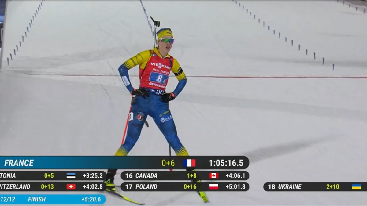 На своем этапе Борковский имел восьмую и седьмую позиции, но Анастасия Меркушина пошла за ним на свой этап только десятой. От лидера отставание было 1:27,5. На первом рубеже украинка получила два круга штрафа. Фактически, это отбросило украинскую команду из претендентов на топ-10. Более того, Меркушина со штрафных кругов вышла на 19-й позиции, однако эстафету Кристине Дмитренко она передала 18-й. На этой позиции украинская команда и завершила гонку.