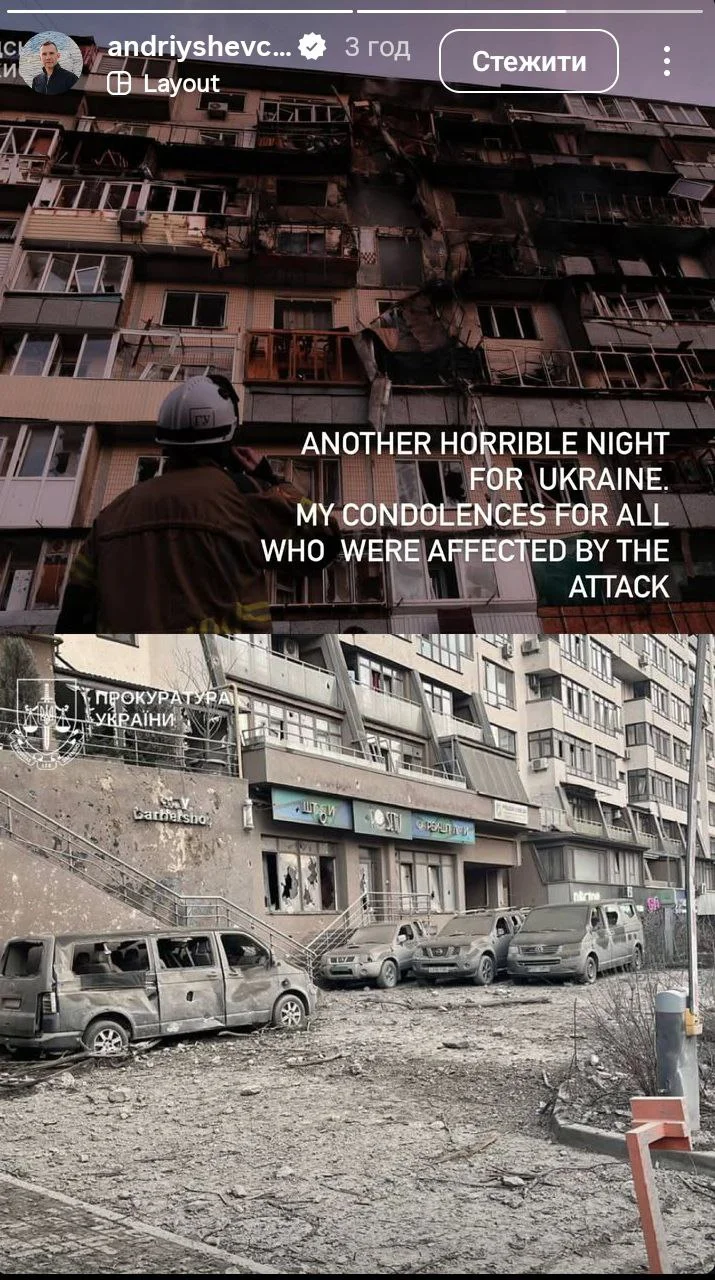 "Еще одна ужасная ночь для Украины. Мои соболезнования всем, кто пострадал от атаки", – написал Шевченко.