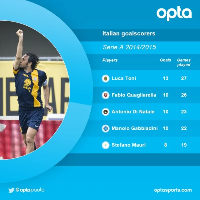 На счету 37-летнего Луки Тони стало 13 голов в 27 играх первенства Италии сезона 2014/15. Экс-игрок "Баварии" и сборной Италии на 2 мяча опережает только аргентинский дуэт Тевес-Икарди. А вот среди итальянцев Тони вне конкуренции.