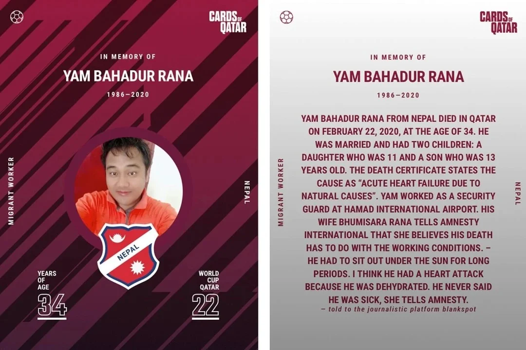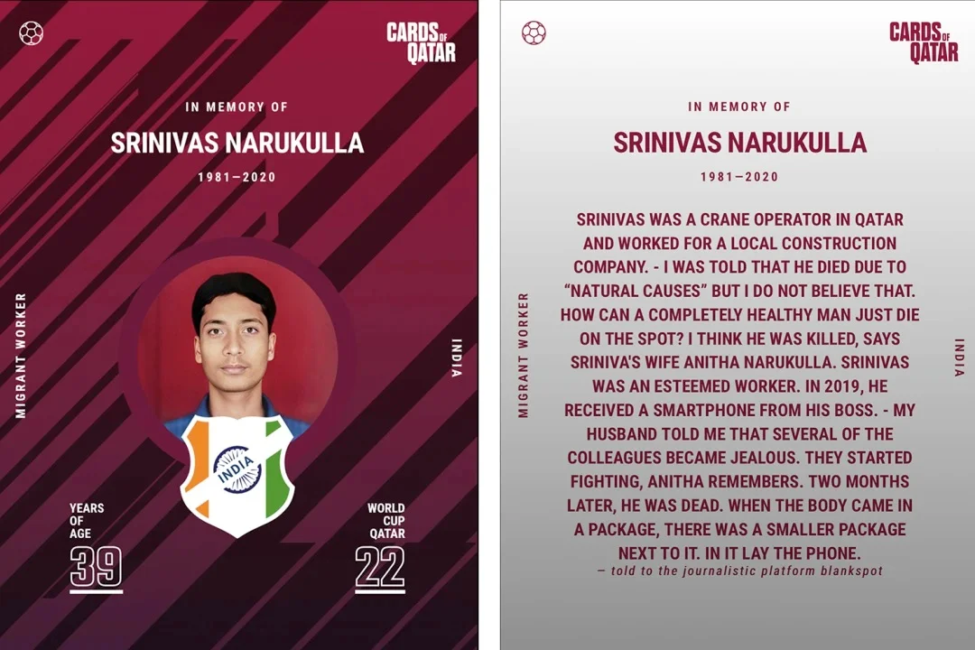 Також я знаю шведського журналіста, який створив сайт Cards of Qatar. На перший погляд, там звичайні футбольні карточки, але на кожній з них – історія мертвого заробітчанина. Перегляньте хоча б декілька. Ви зрозумієте, чому я пишу про Катар.