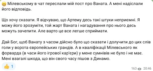 Журналіст Українського футболу Данило Вереітін у своєму телеграм-каналі "Рахунок на табло" пригадав нещодавній обмін шпильками між Мілевським та Ванатом. Історія отримала продовження...