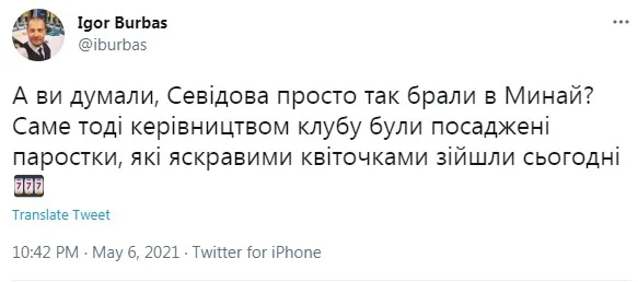 Скандал после встречи прокомментировал Игорь Бурбас. "А вы думали, Севидова просто так брали в Минай? Именно тогда руководством клуба были посажены ростки, которые яркими цветочками сошли сегодня", – написал журналист в своем Twitter.
