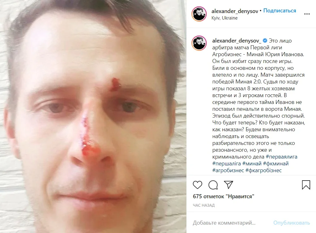 "Это лицо Юрия Иванова – арбитра матча Первой лиги Агробизнес – Минай.Он был избит сразу после игры. Били в основном по корпусу, но досталось и по лицу. Матч завершился победой Миная – 2:0. Судья в течение игры показал 8 желтых хозяевам встречи и 3 игрокам гостей. В середине первого тайма Иванов не поставил пенальти в ворота Миная. Эпизод был действительно спорным.