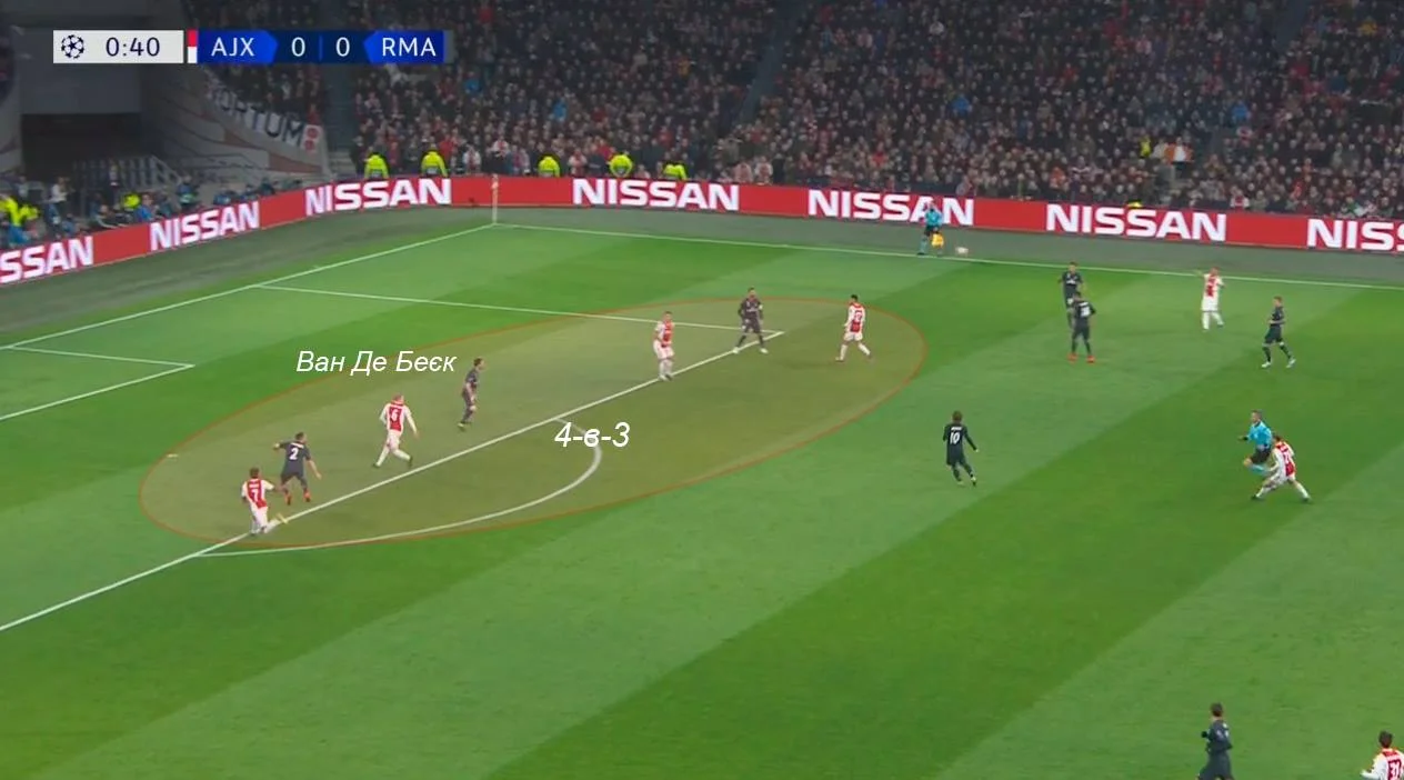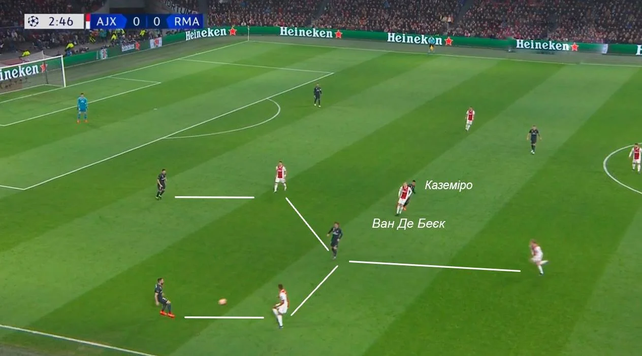 Особенно успешным был прессинг аяксидов. Ключевую роль в нём занимал Ван Де Беек, который при позиционной обороне не отходил от Каземиро, часто выключая бразильца из обороны Реала.
