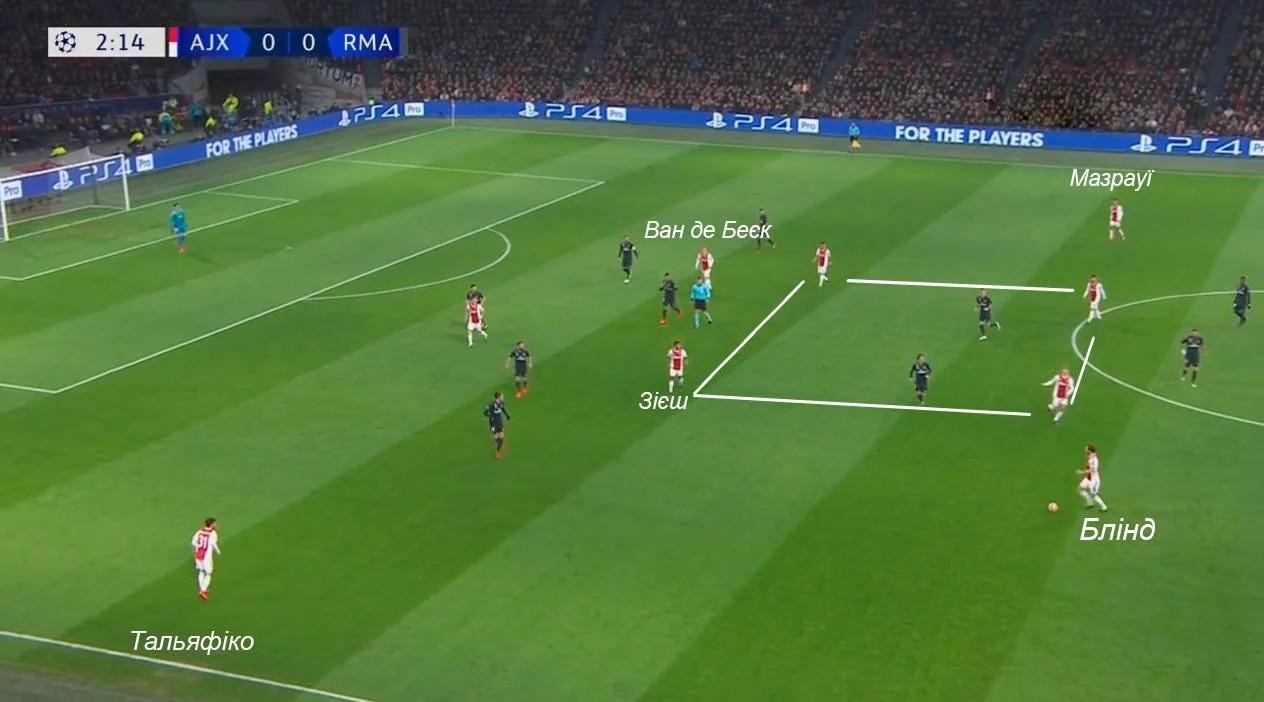 С подобным давлением можно было бы мириться, если бы не чрезвычайно смелая игра Аякса. При позиционном наступлении Ван Де Беек шёл вперед, его место занимал один из центрбеков, а на флангах атаки располагались фулбэки Тальяфико и Мазрауи. Форварды могли оттягиваться для обыгрыша или перегрузки зон.