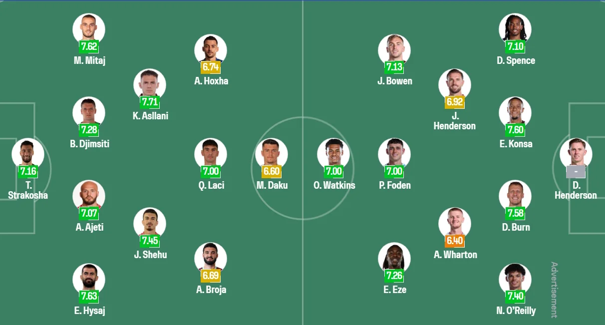 Албания: Стракоша – Хюсай, Аети, Джимсити, Митай – Стеху, Асллани, Лачи – Броя, Даку, Ходжа