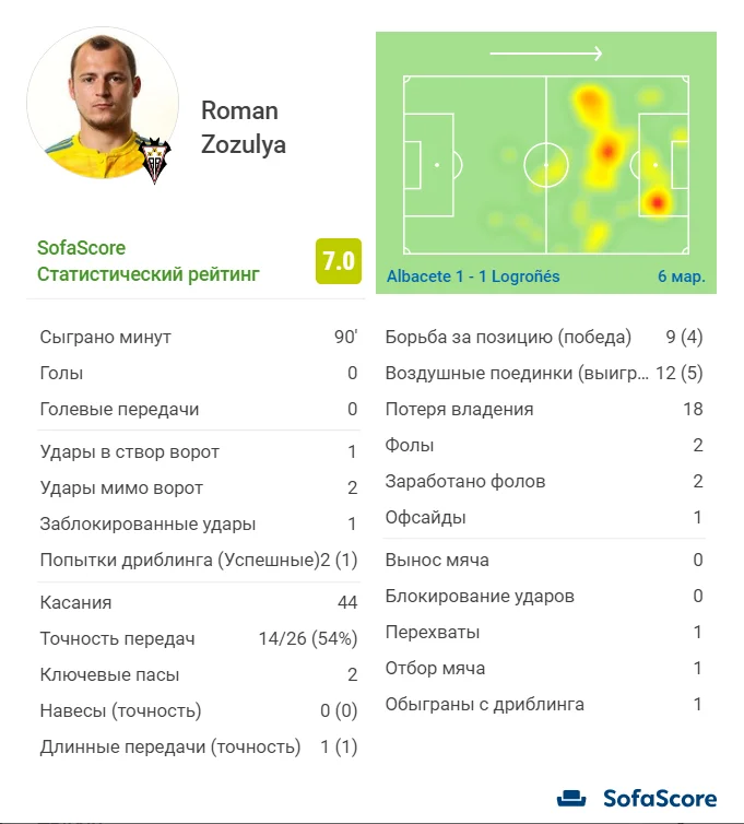 Картина матча вполне соответствовала нынешнему состоянию команд – мало моментов и ударов по воротам. Альбасете вообще забыл об атаке, сконцентрировавшись на борьбе. "Механический сыр" собрал 5 желтых карточек, одна из которых досталась Зозуле. Даже с "горчичником" украинец стал лучшим в составе своей команды по версии SofaScore (оценка 7).