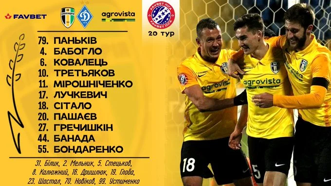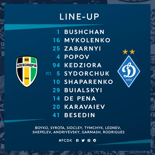 Динамо: Бущан – Кендзера, Забарный, Попов, Миколенко – Сидорчук (к), Шапаренко – Караваев, Буяльский, Де Пена – Беседин