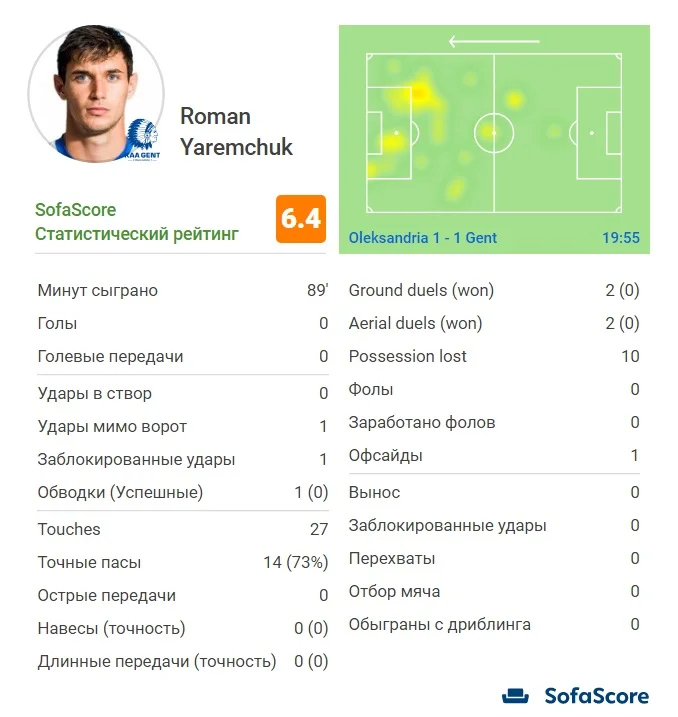 Нападающий традиционно для себя проделал огромный объем работы, но эффективности в этот вечер ему не хватало. Из четырех единоборств (по два в воздухе и внизу) Яремчук не сумел выиграть ни одного, точность его пасов составила всего 73%, что недостаточно даже для форварда. Добавим сюда четыре потери и получим худшего игрока в составе обеих команд по оценкам статистических порталов Whoscored (5.9) и Sofascore (6.4). Справедливости ради заметим, что на сомнительное первенство вполне мог претендовать Депуатр, но его спас забитый мяч.