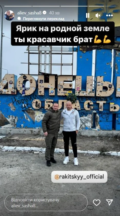 Алиев в своем Instagram обнародовал фотографию вместе с Ярославом Ракицким – они сфотографировались на фоне въезда в Донецкую область.