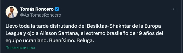"Весь день я с удовольствием смотрел матч между Бешикташем и Шахтером в Лиге Европы и особенно следил за игрой Алиссона Сантаны, 19-летнего бразильского вингера "горняков". Невероятная игра. Настоящий нокаут", – написал Ронсеро в своих соцсетях.