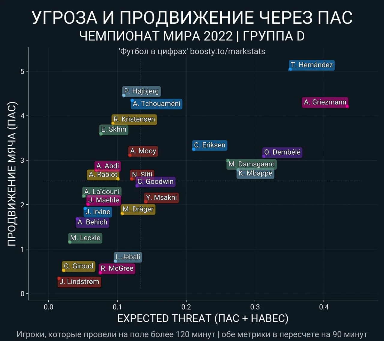 Эта история дополняется феноменальной игрой Гризманна – "маленький принц" появляется на всех участках поля, создавая численное большинство и помогая в организации атак эффективными обыгрышами. В конце концов, эффективно выглядят фланговые прорывы Дембеле. Показательно, что Килиан, Тео, Антуан и Усман стали лучшими футболистами группы D по показателю продвижения мяча и созданию угрозы чужим воротам через пас.