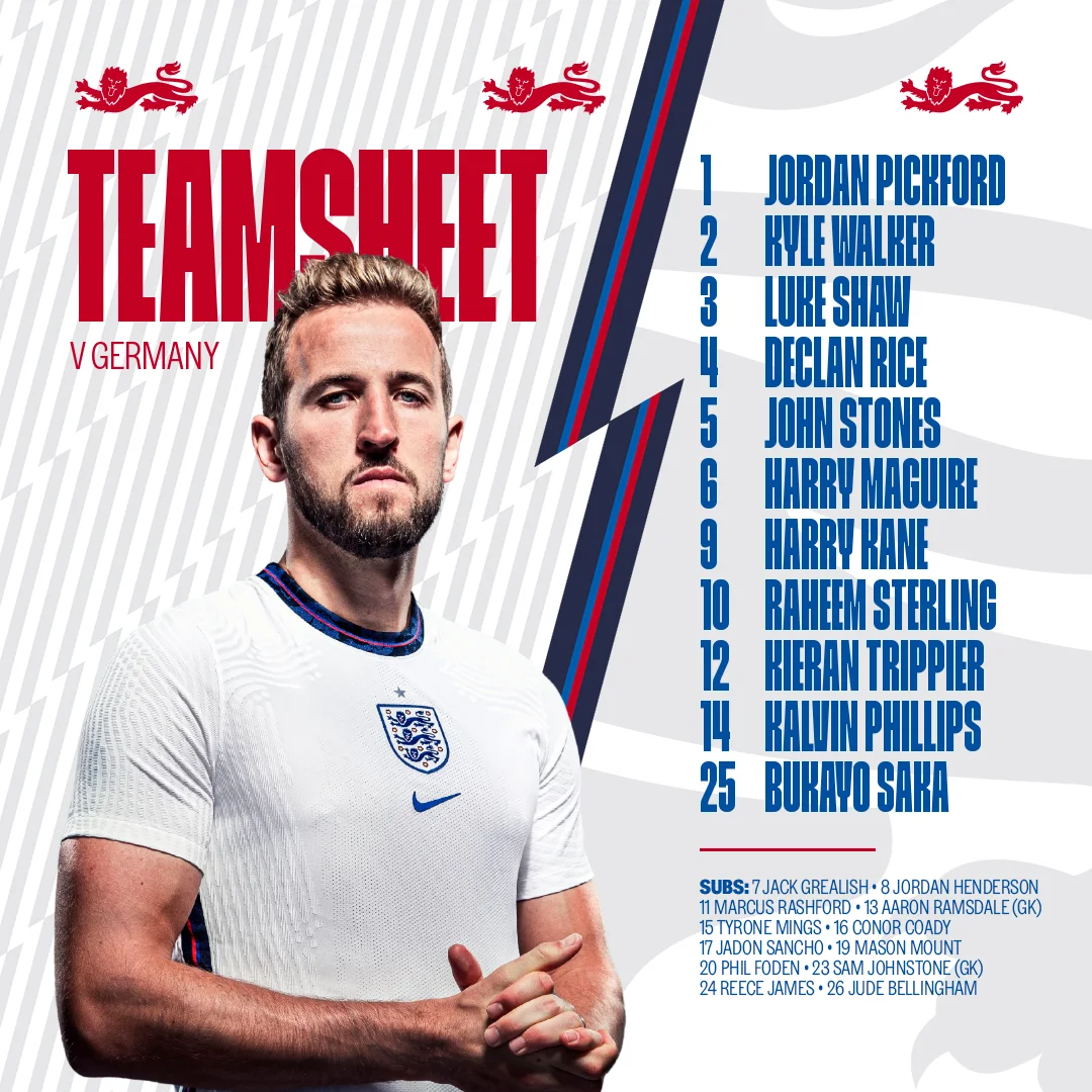 Англия: Пикфорд – Уокер, Магуайр, Стоунз – Триппьер, Филлипс, Райс, Шоу – Сака, Кейн, Стерлинг