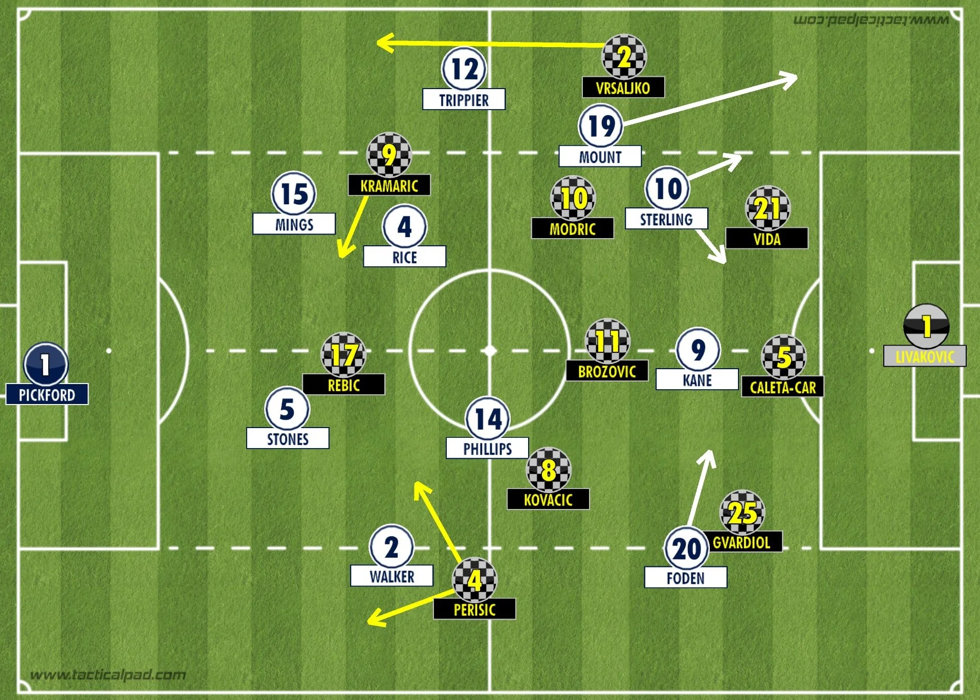 Англия и Хорватия – фавориты группы D. Очный поединок сразу проэкзаменовал готовность команд. Они встречались в полуфинале ЧМ-2018, тогда сильнее оказались хорваты. У Златко Далича основной состав с тех пор не очень изменился. На авансцене те же герои. Совершенно новое лицо только слева в обороне – фланг доверили юному Йошко Гвардиолу.