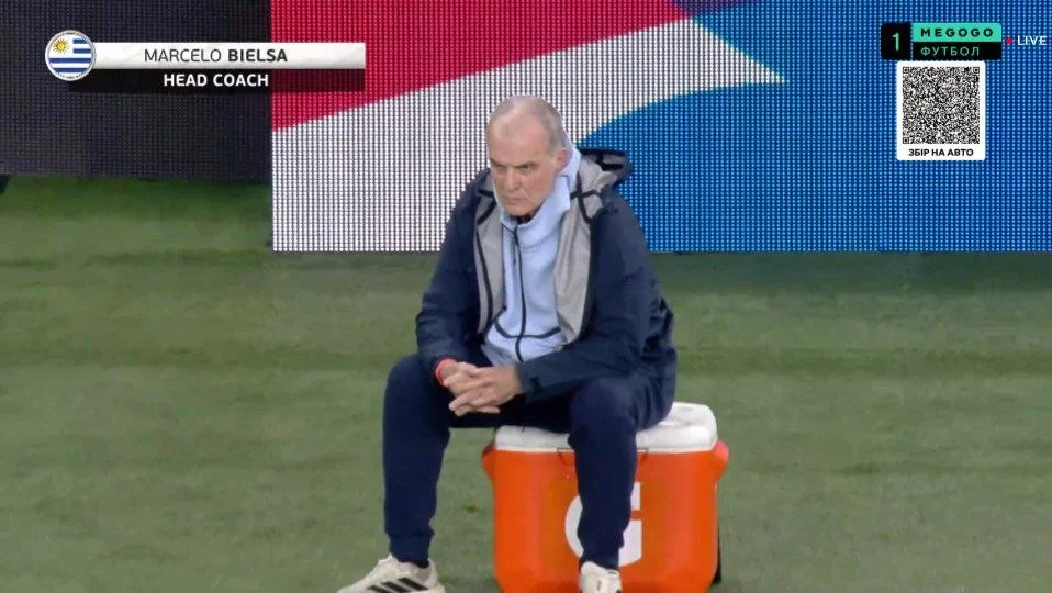 Наставник сборной Уругвая уже привычно сидел на сумке-холодильнике. Для него Англия не является чужой страной, ведь здесь он очаровывал болельщиков Лидса, возглавляя "павлинов" с 2018 по 2022 годы.
